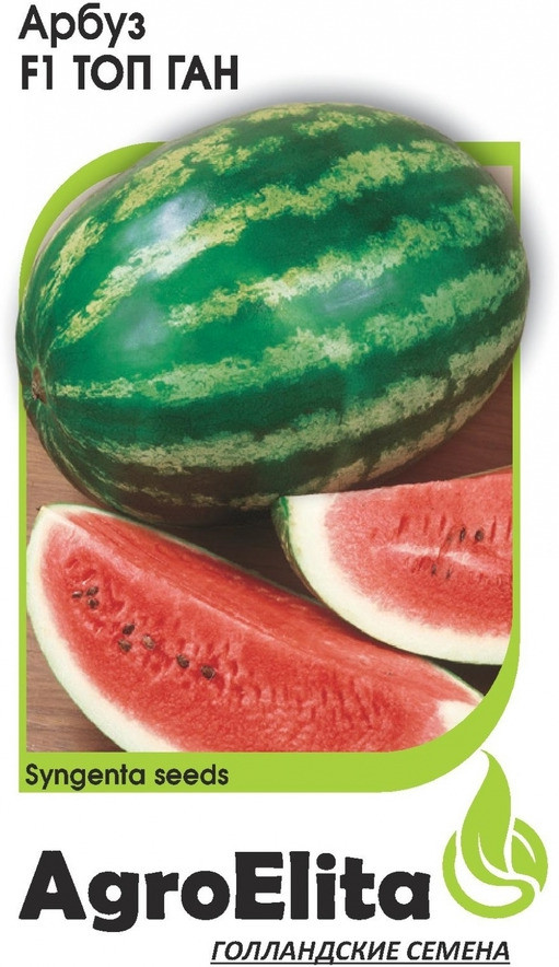 Арбуз Топган F1. Реннеспелый длинноплетистый гибрид зарубежной селекции. Период от высадки рассады до первого сбора 58-60 дней, от всхода до созревания 70-80 дней. Плод округло-овальный, зеленый с темными полосами, гладкий, массой 8-10 кг. Кора толщиной1,5-2,2 см. Мякоть темно-красная, плотная с отличной внутренней структурой. Высокие вкусовые качества. Крупные листья хорошо защищают плоты от солнечных ожогов. Посев семян на рассаду 5 месяц, пересадка в открытый грунт 6 месяц, схема 280х120см., сбор урожая 8 месяц.