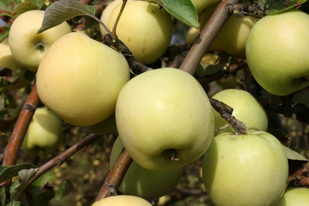 - Плоды крупные (100-150 г), округло-конические, ребристые, светло-желтые, на солнце золотисто-желтые без румянца, мякоть зеленовато-белая, плотная, сочная